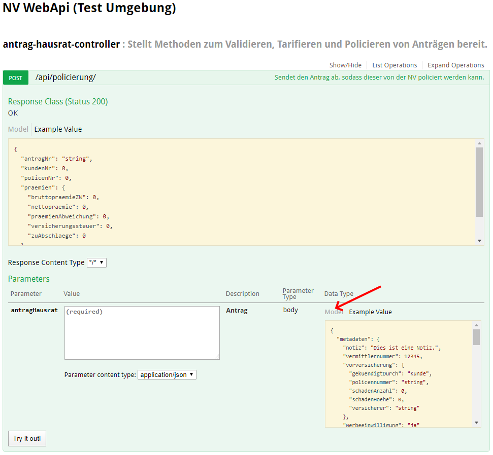 Um diese Informationen anzuzeigen kann die gewünschte Methode (hier z.B. Policierung) aufgeklappt werden. Anschließend erfolgt unten rechts ein Klick bei Model. Daraufhin werden die Details sichtbar. Zur besseren Übersicht sollte das JSON herauskopiert und in einem Editor mit Syntax Highlighting eingefügt werden.